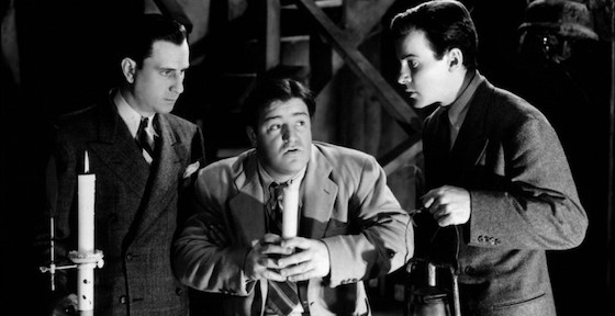 With a crisp black-and-white transfer, Hold That Ghost lands on blu-ray thanks to the crackling efforts of Shout Select. Shadows, while not too terribly detailed, are thick and atmospheric throughout. Presented with an aspect ratio of 1.37:1, the film looks marvelous and easily beats the poor appearance on television and on home video DVD that has previously dogged it. The blacks and grays are handled expertly by the transfer. Beads of sweat are visible, wet city streets, textures in clothing, and even the dirt in the pavement is all visible with fine textures throughout.